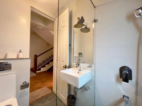 Toiletries, washbasin with mirror, toilet, shower unit, WC